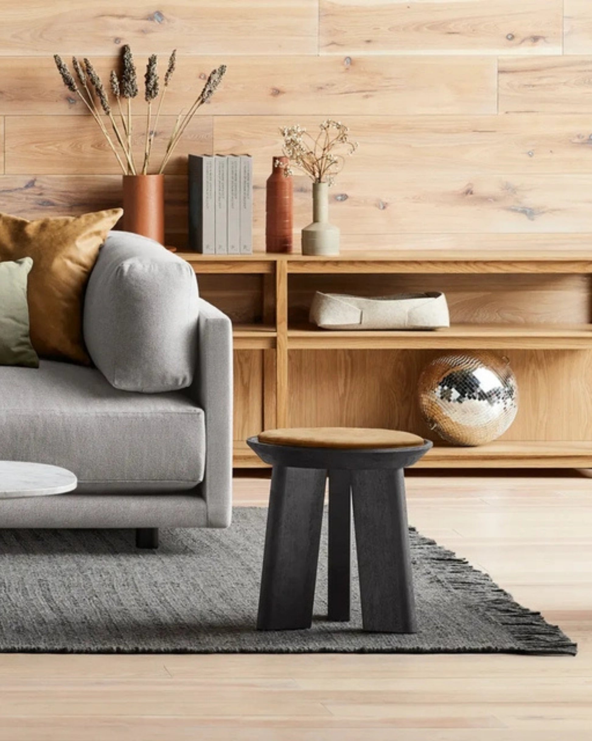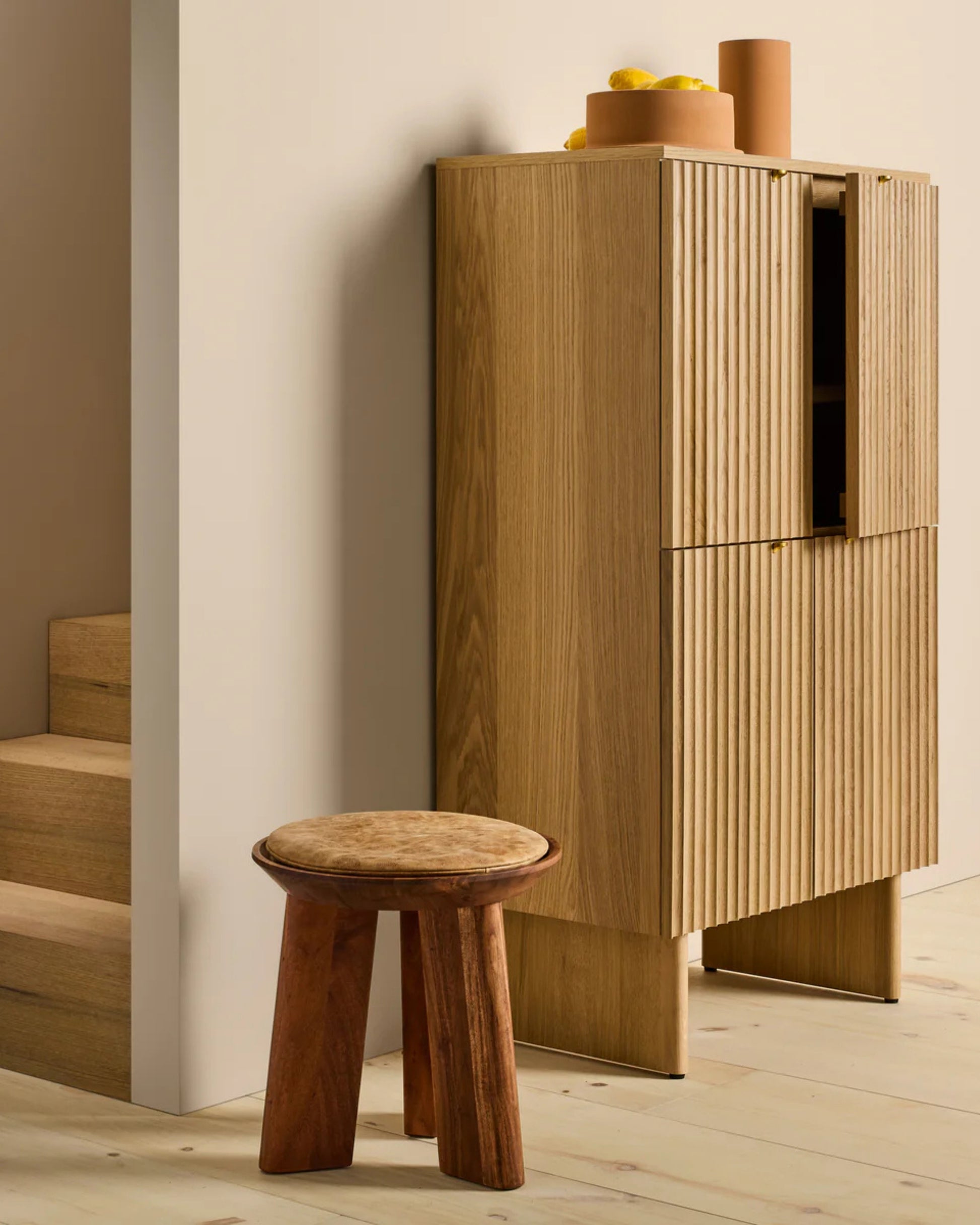 A refined stool with a leather seat and solid wood legs, designed to bring quiet strength and timeless character to any space.