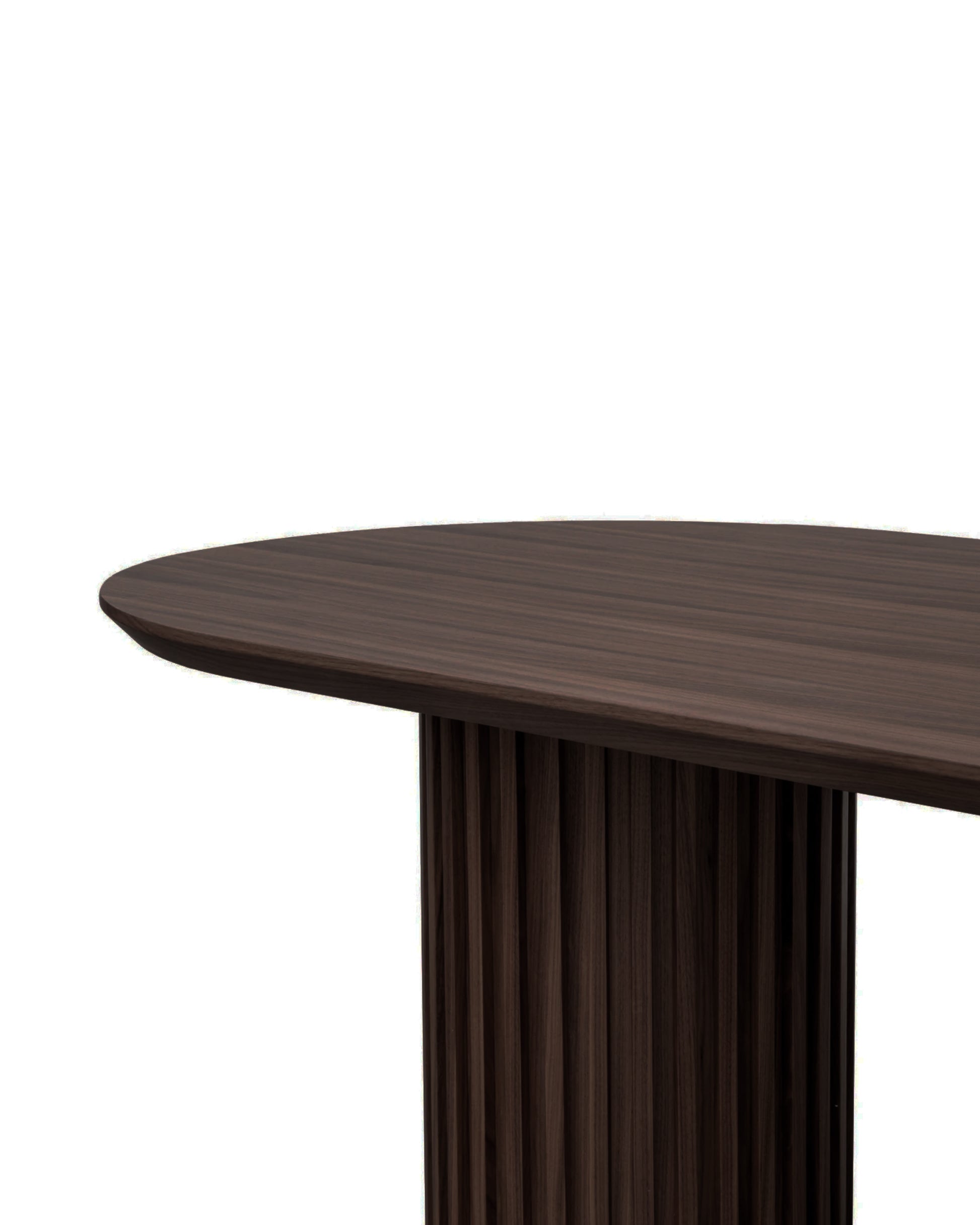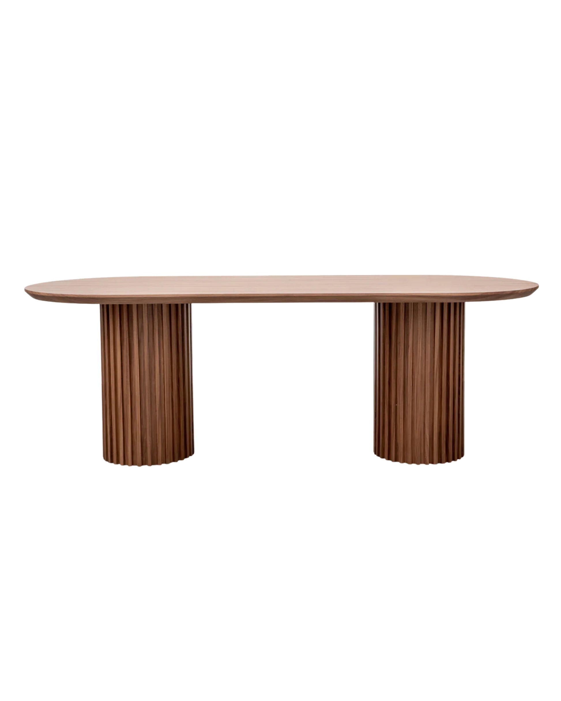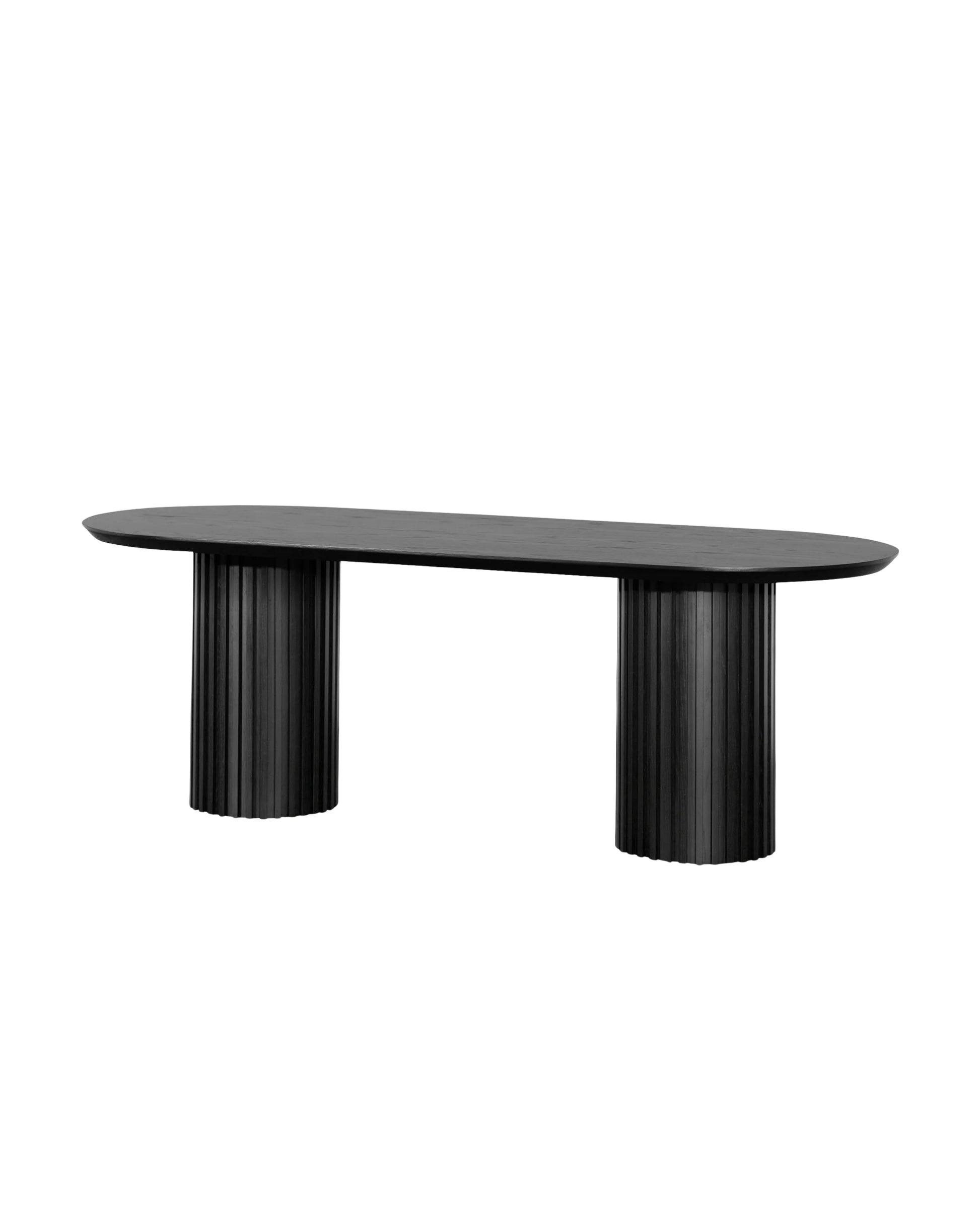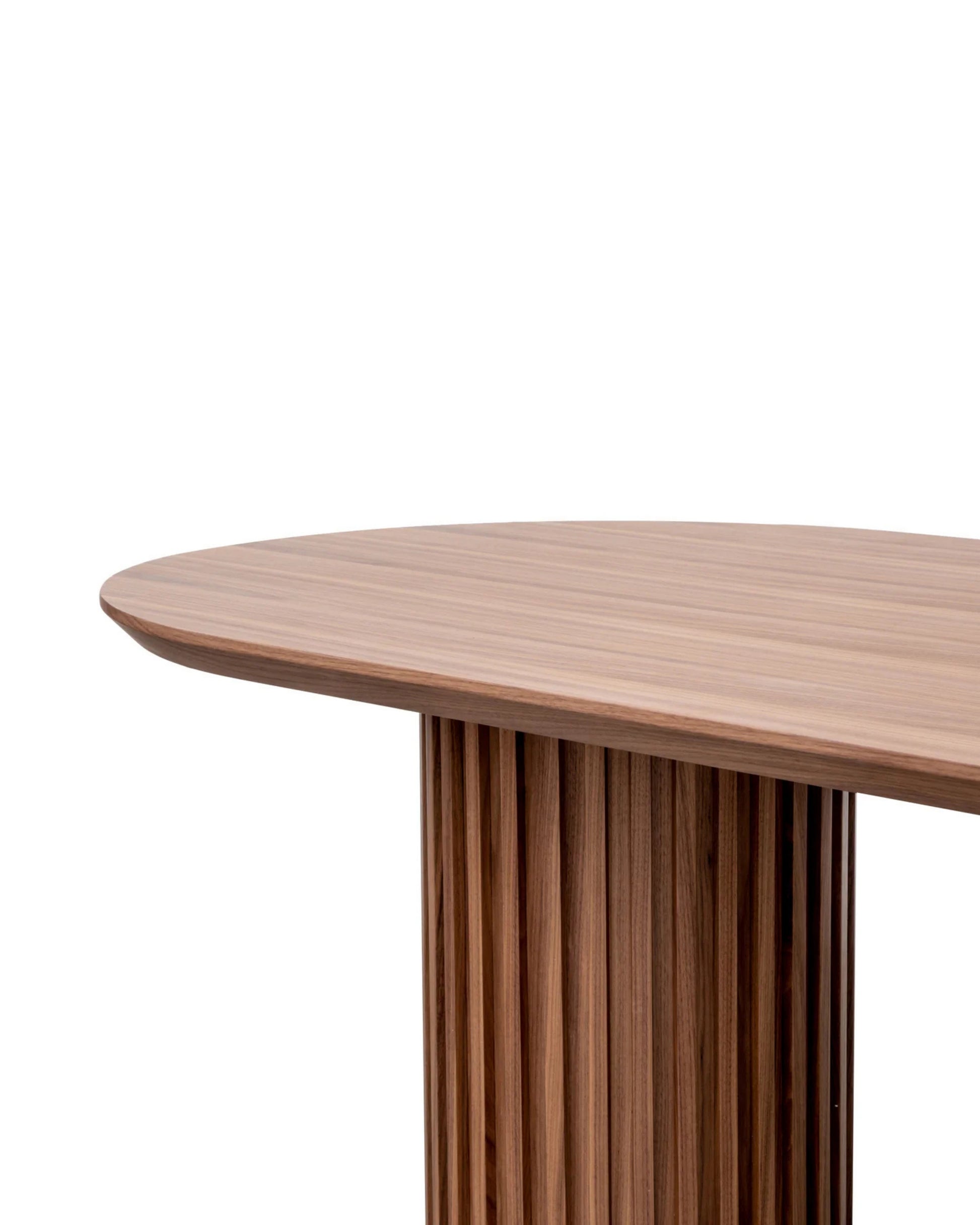 Combines cylindrical slatted solid wood legs with a sleek oval tabletop, balancing material authenticity and functional form for a refined dining centerpiece.