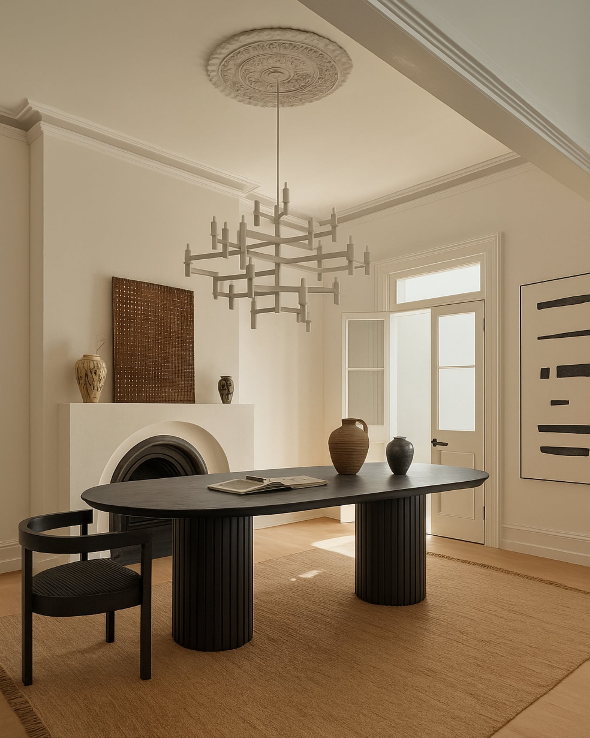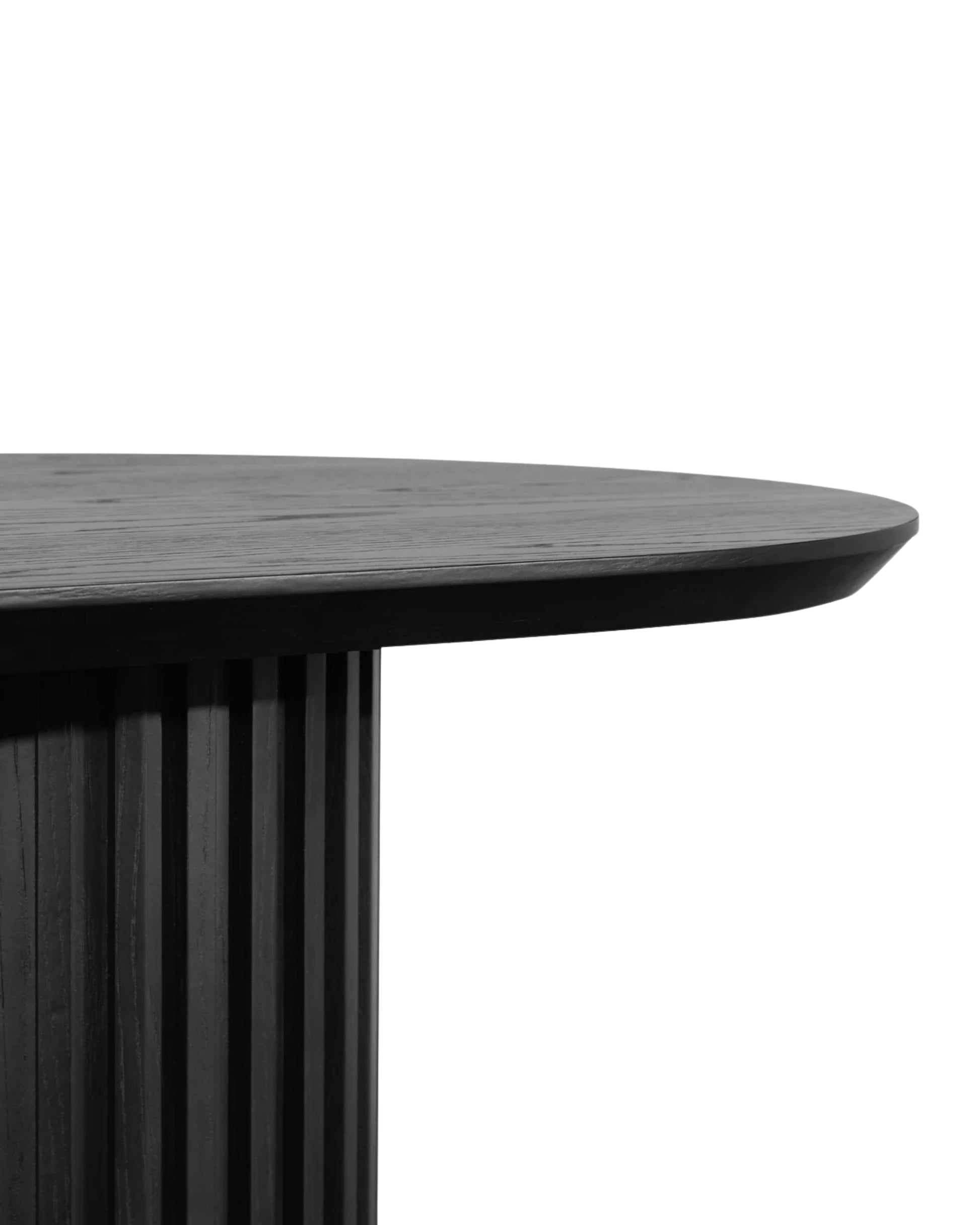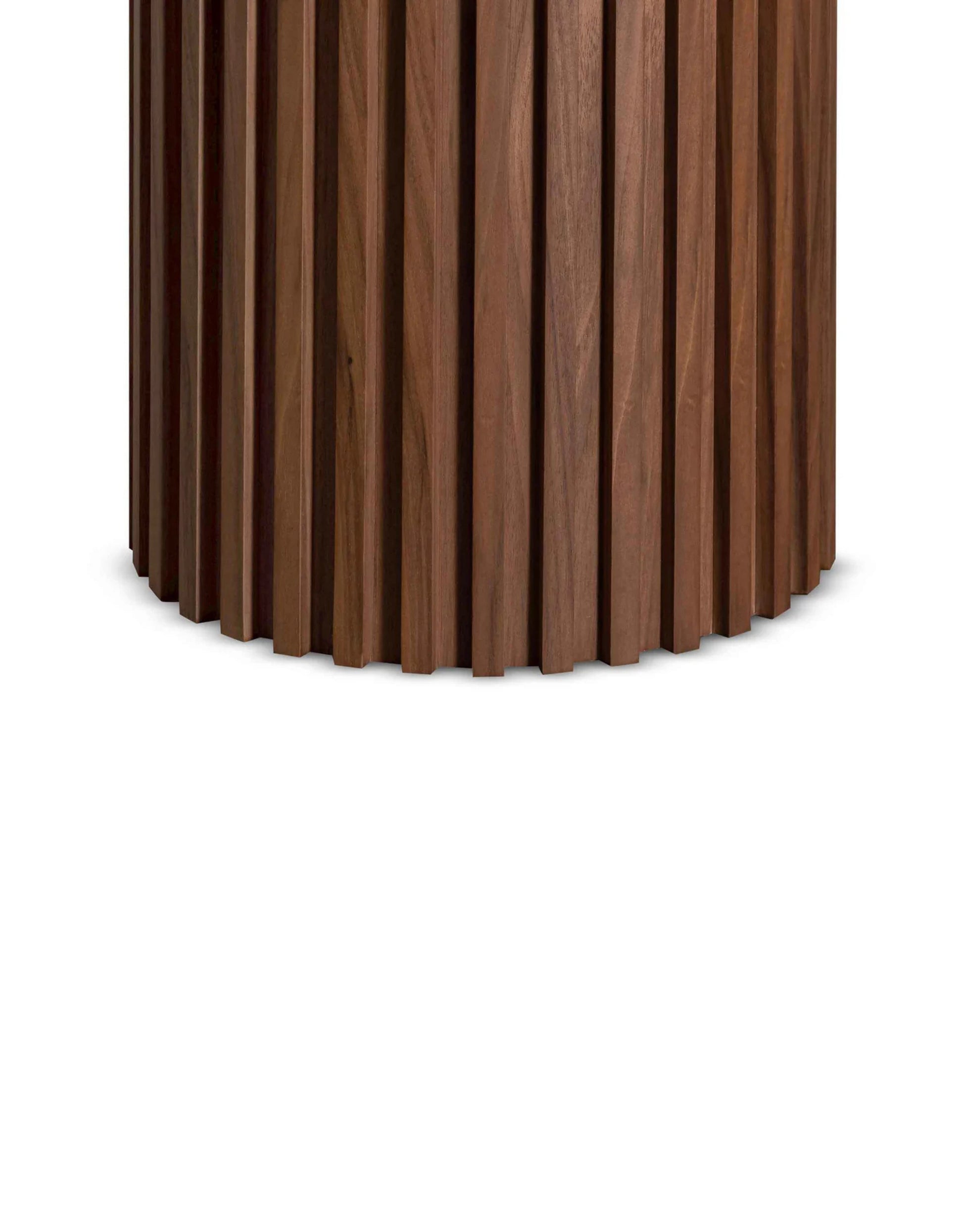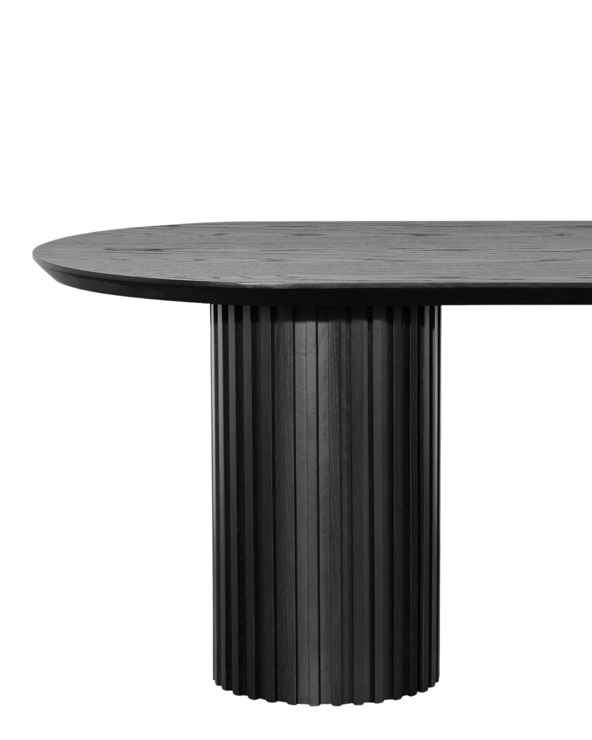 Combines cylindrical slatted solid wood legs with a sleek oval tabletop, balancing material authenticity and functional form for a refined dining centerpiece.
